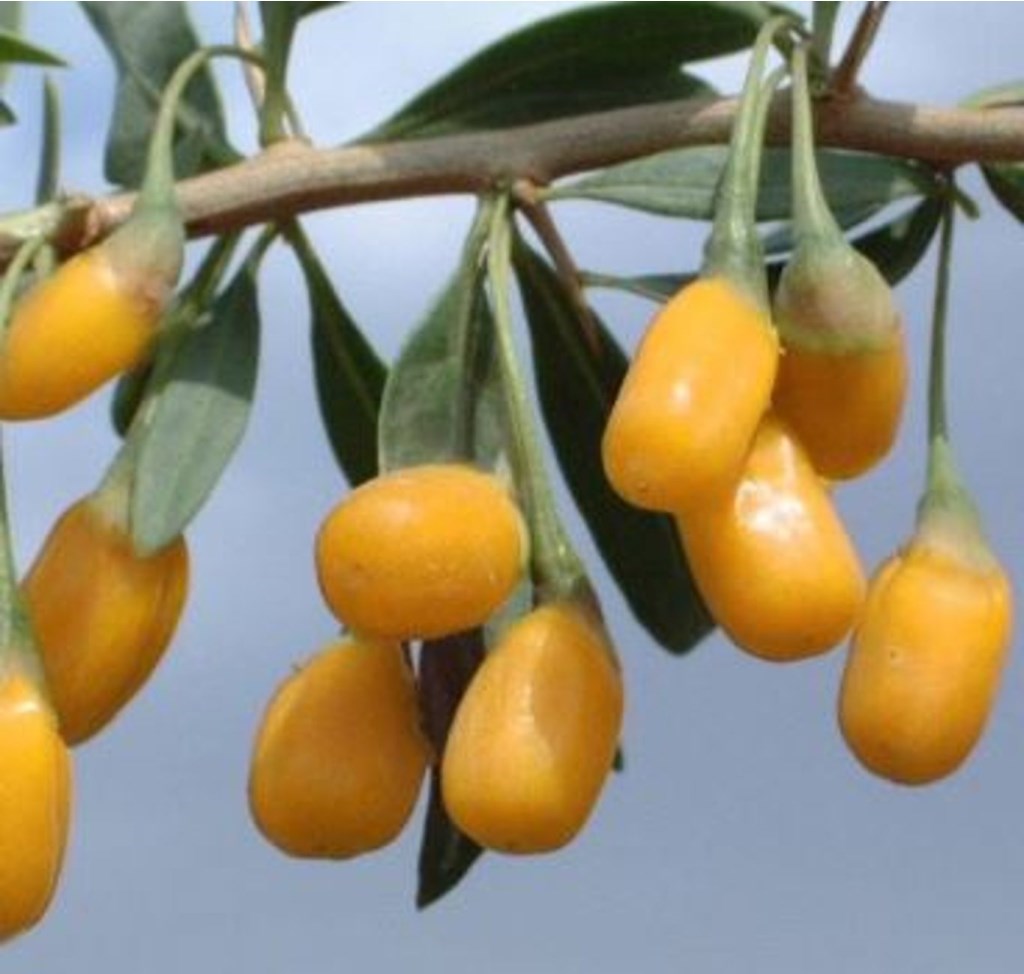 Lycium barbarum ‘Amber Sweet Goji’ er en løvfellende gojibærbusk som skiller seg ut ved sine gyllengule bær og ekstra søte smak. Dette er en spennende og dekorativ sort som kombinerer nytte og prydverdi i hagen.